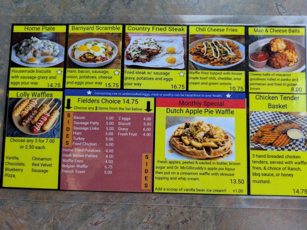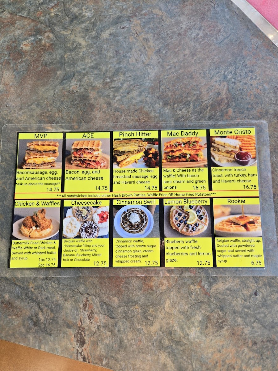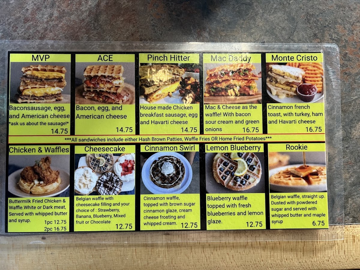 House made chicken breakfast sausage, egg and Havarti Cheese waffle sandwich. Served with waffle fries, hashbrown patties OR home fried potatoes and a side of maple syrup