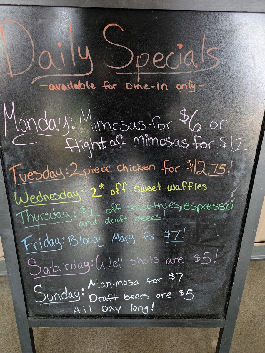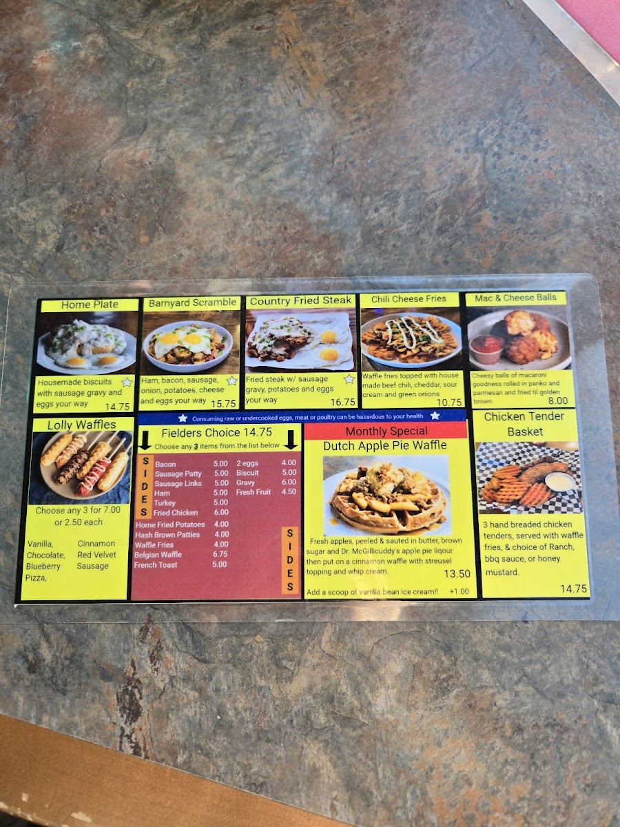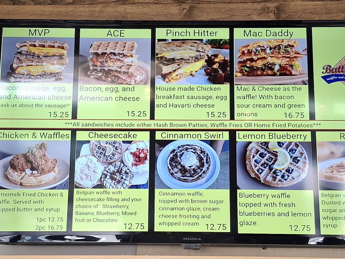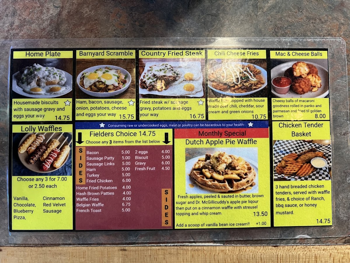 House made chicken breakfast sausage, egg and Havarti Cheese waffle sandwich. Served with waffle fries, hashbrown patties OR home fried potatoes and a side of maple syrup
